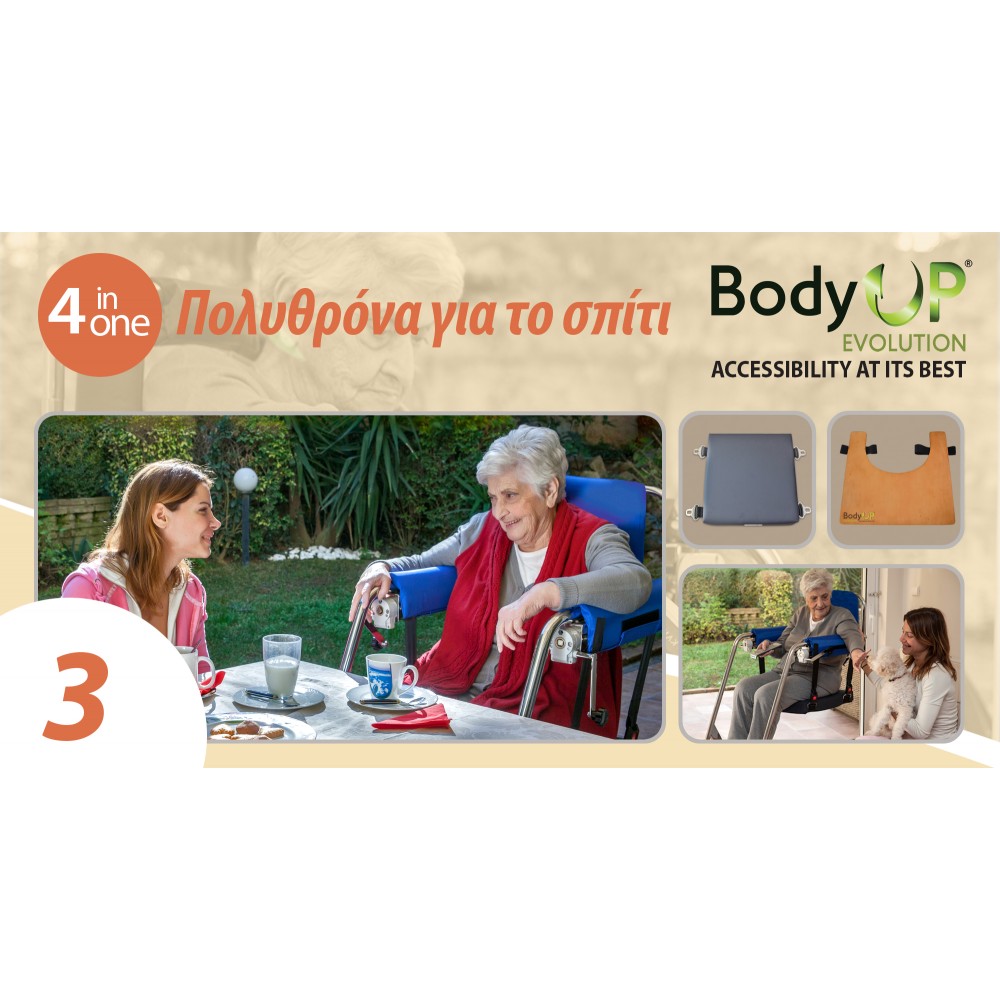 - Μετά την ανασήκωση, το Body Up Evolution δίνει την επιλογή να χρησιμοποιηθεί ως τροχήλατη πολυθρόνα σπιτιού.