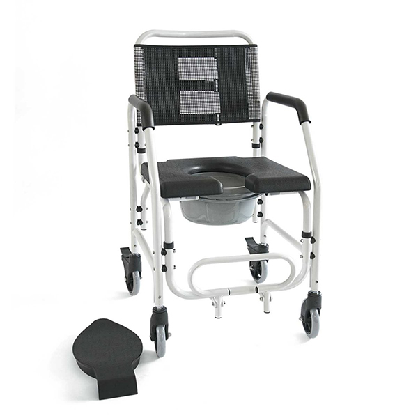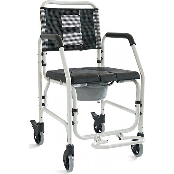 Τροχήλατη καρέκλα µπάνιου από ελαφρύ κράµα αλουµινίου. Αδιάβροχη και σταθερή µε ανακλινόµενο υποπόδιο.