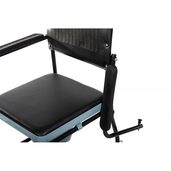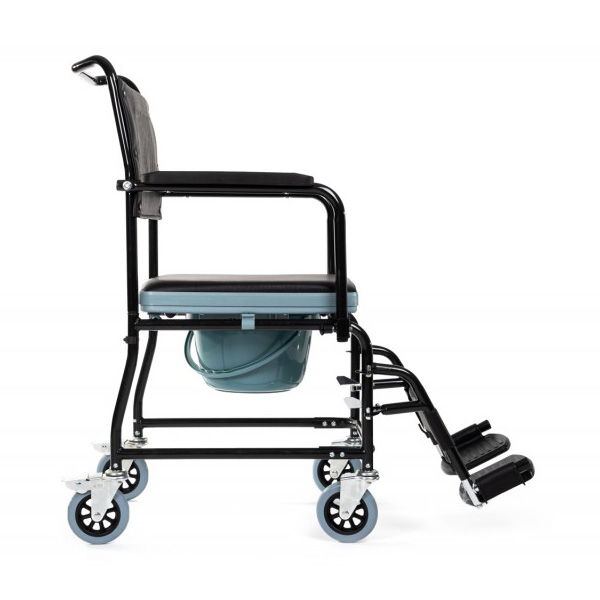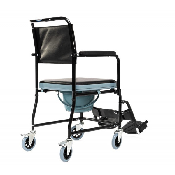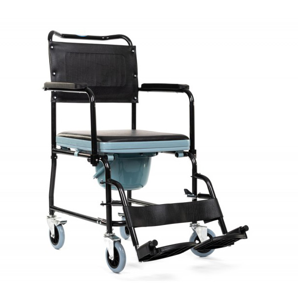 Αναπηρικό αμαξίδιο με στρογγυλό δοχείο απλού τύπου, το οποίο διαθέτει αποσπώμενο πλαστικό δοχείο καθώς επίσης και φρένο στους πίσω τροχούς, για μεγαλύτερη ασφάλεια.