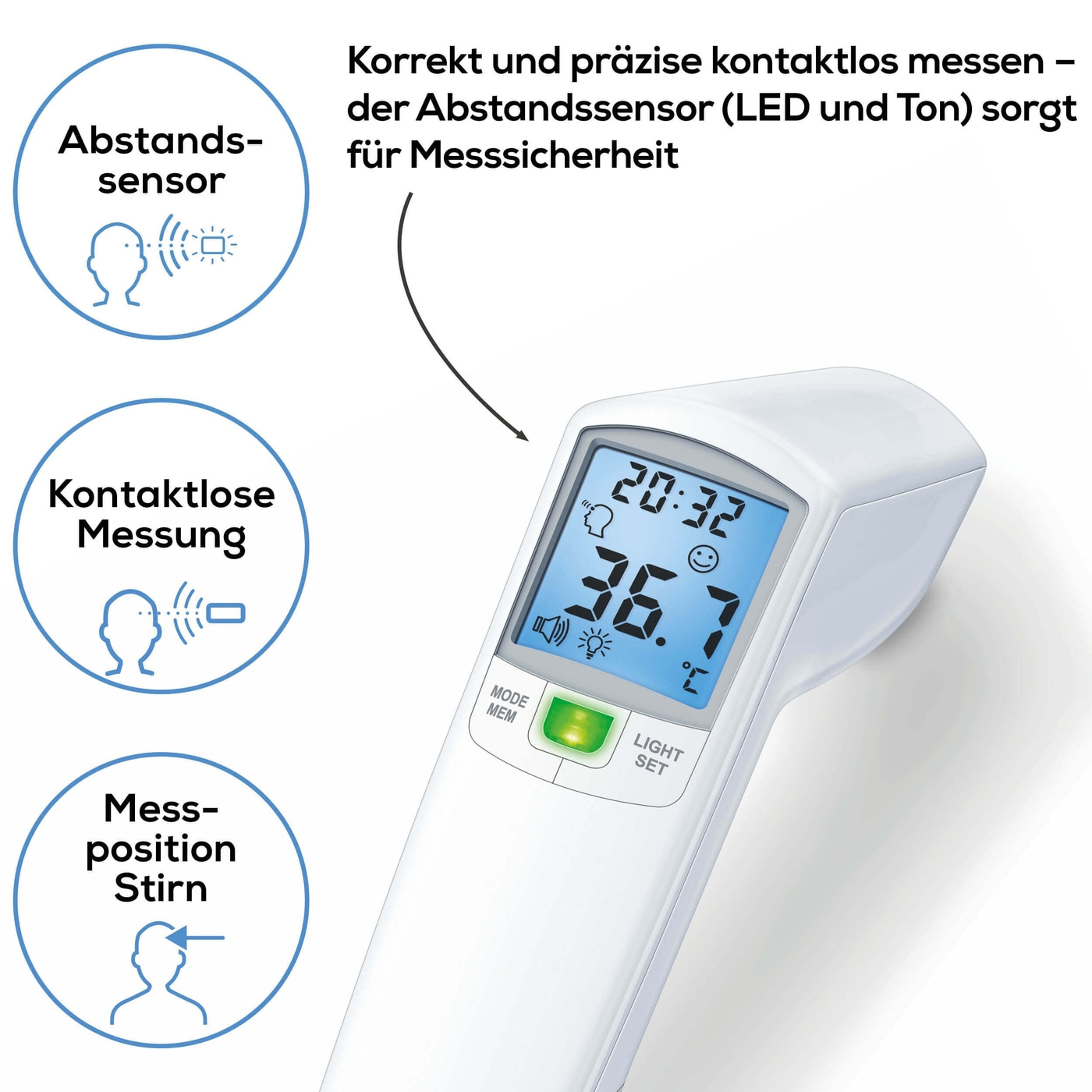 - Μετρά χωρίς να έρχεται σε επαφή με δέρμα-υγιής και ασφαλής μέτρηση χάρη στον αισθητήρα απόστασης (ηχητικό σήμα / μπλε LED)
