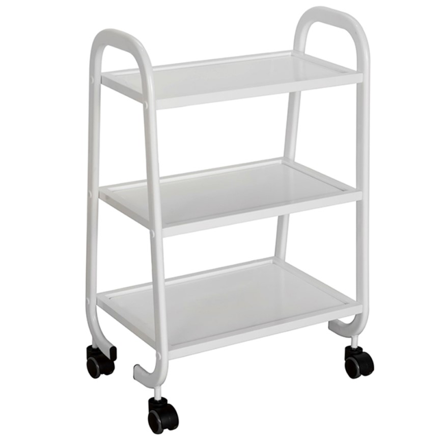 Τραπέζι αισθητικής τροχήλατο με μεταλλικό σκελετό σε μινιμαλιστική σχεδίαση, λευκό χρώμα.