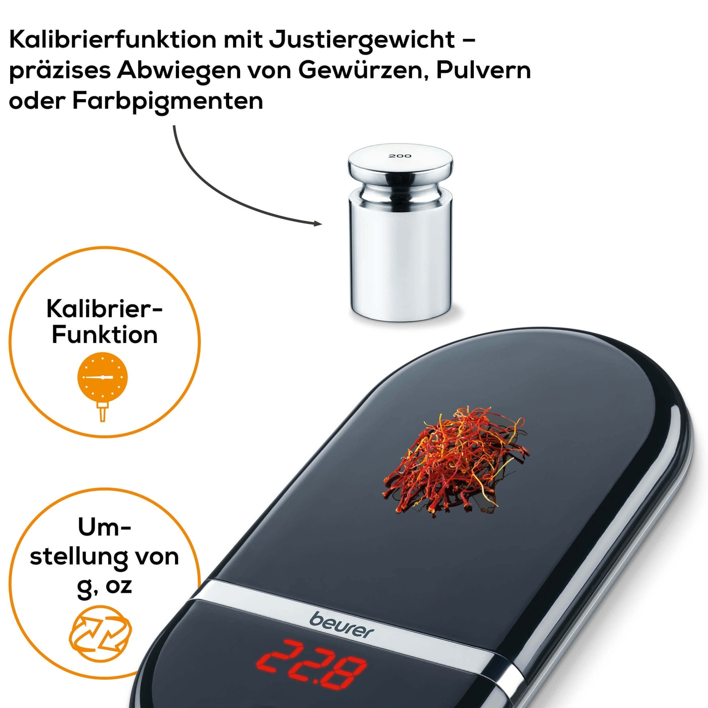 - Ζυγαριά κουζίνας ακριβείας Beurer KS 36 για τη ζύγιση μπαχαρικών, σκονών και χρωστικών ουσιών.