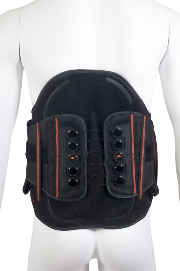 - Διαθέτει δύο οπίσθια πάνελ από πλαστικό με σύστημα τροχαλίας και κορδόνι για ρυθμιζόμενη πίεση του νάρθηκα.
