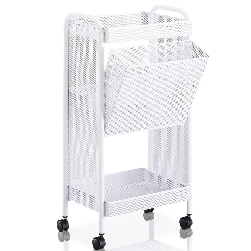 Μεταλλικό τροχήλατο με διάτρητη σχεδίαση σε λευκό χρώμα. Εξοπλισμένο με 3 ράφια και 1 επικλινές για την τοποθέτηση εργαλείων.